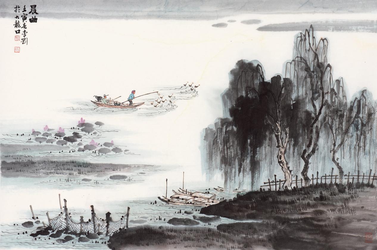 李刚浸淫传统山水画多年,深研历代诸家,尤重董源一脉南宗源流;于近现代则倾心于陆俨少云水流韵、黄宾虹浑厚华滋,此二者与其温厚性情及水乡生活体悟相契相融,逐渐淬炼出渊源深厚且颇具个性的笔墨语言。其近年新作《灵龙水乡淮杂故里》、《大美九龙口》等系列,以平远视角聚焦家乡建湖风物─芦荡滩涂、舟楫渔网、村落农人、走兽飞鸟交织成一幅幅“村在水中筑,人在荡中游”的农家生活场景。其笔墨松动氤氲,层次丰沛华滋,水乡温润气息跃然纸上。青绿之作如《青山幽居》,追求墨彩天然契合,格调淡雅清新;《岁月静好》则另辟蹊径,以蕴含装饰美感的形式风格,与精心提炼的生活符号相得益彰。