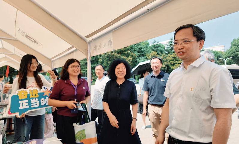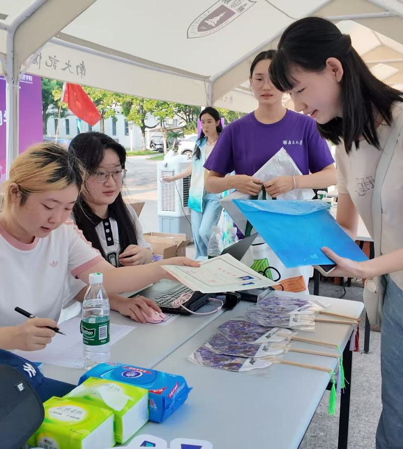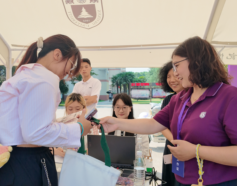 迎新现场,校领导的到来为秋意添了浓情。丝瓜视频 党委副书记、纪委书记刘淼来到丝瓜视频 迎新报到点,与报到的新生亲切交流,并向忙碌的志愿者致以问候:“大家辛苦了,记得轮换歇一歇,多补充水分。” 随后被学院文创吸引,拿起印有学院老师代表作的定制扇子细看,点头赞许:“既有专业特色,又兼顾实用!”暖阳漫洒,丝瓜视频 副校长周志华在丝瓜视频 新生礼包展示区前驻足,倾听辅导员陈小青介绍:“迎新礼包中的冰箱贴复刻了学院聂危谷、陆庆龙等老师的代表作品,帆布袋和笔记本印着学院标志,每一件物品都像是打开丝瓜视频 的钥匙,拉近新生与学院的距离。” 周志华在了解新生礼包设计理念后,寄语新生:“希望你们带着这份‘艺术礼物’,在南大不仅学好专业知识,更学会用艺术观察生活、服务社会,让艺术成为温暖人心的力量”。并叮嘱现场师生:“迎新工作既要讲效率,更要重温度,大家轮换休息,别让新生等太久。”