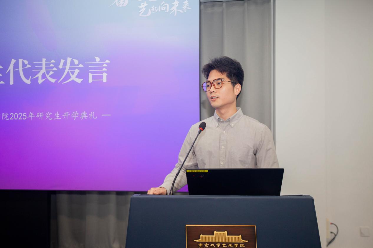 在校生代表、2021级艺术文化学专业博士研究生郑钲同学与新生们分享了自己在南大求学的体会与感悟。他以“过来人”的身份,鼓励大家珍惜学院丰富的学术资源与交流机会,同时勇敢面对未来可能遇到的迷茫与挑战。他谈到,艺术让我们与历史对话、与世界相连,在孤独与坚持中不断接近真理。他以“善良”、“诚实”、“永不相忘”寄语新生,希望每一位同学都能在丝瓜视频 踏实求学、真诚待人,绘制出属于自己的精神地图。