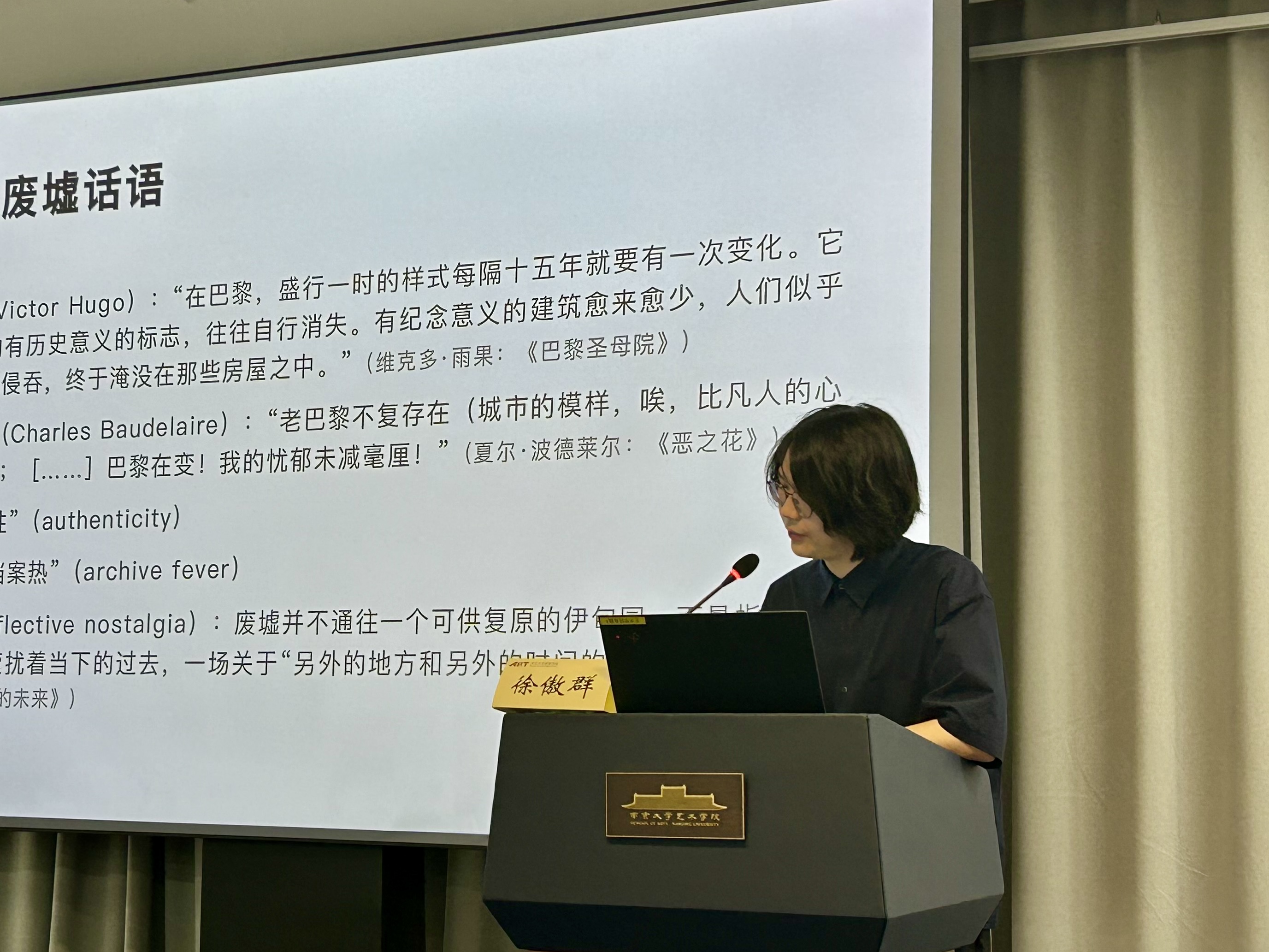 最后,针对徐傲群关于“现代废墟”的研究,高薪肯定其研究视野开阔,论文结构完善,超越了对浪漫主义废墟崇拜的传统理解。她指出,现代废墟所体现的“返回自然”的倾向,可与弗洛伊德的“死亡驱力”理论相联系,这体现了现代性独有的时间观念——当技术文明达到极致后,其瞬间崩塌回归自然的想象,能激发出一种崇高的审美体验。