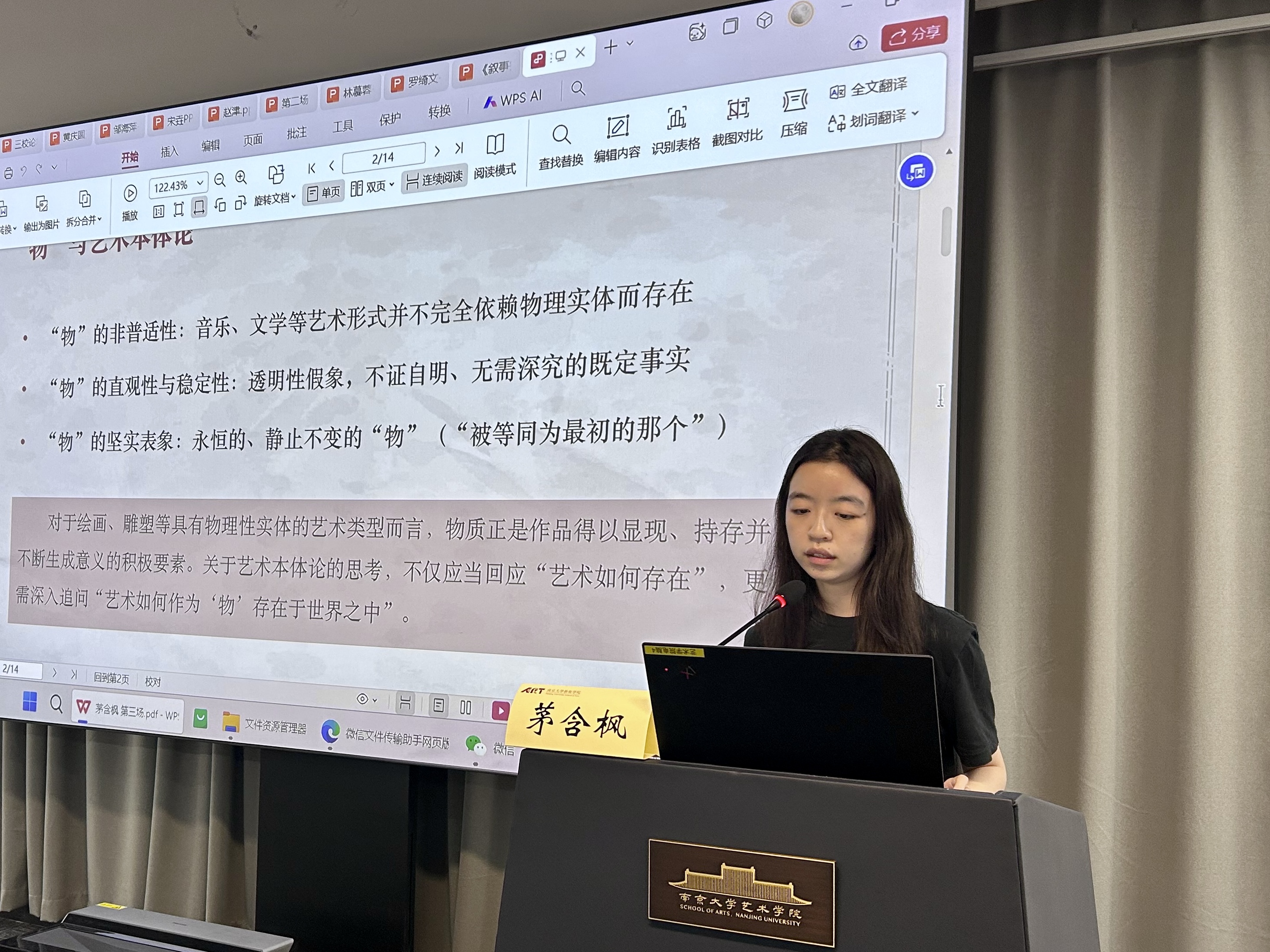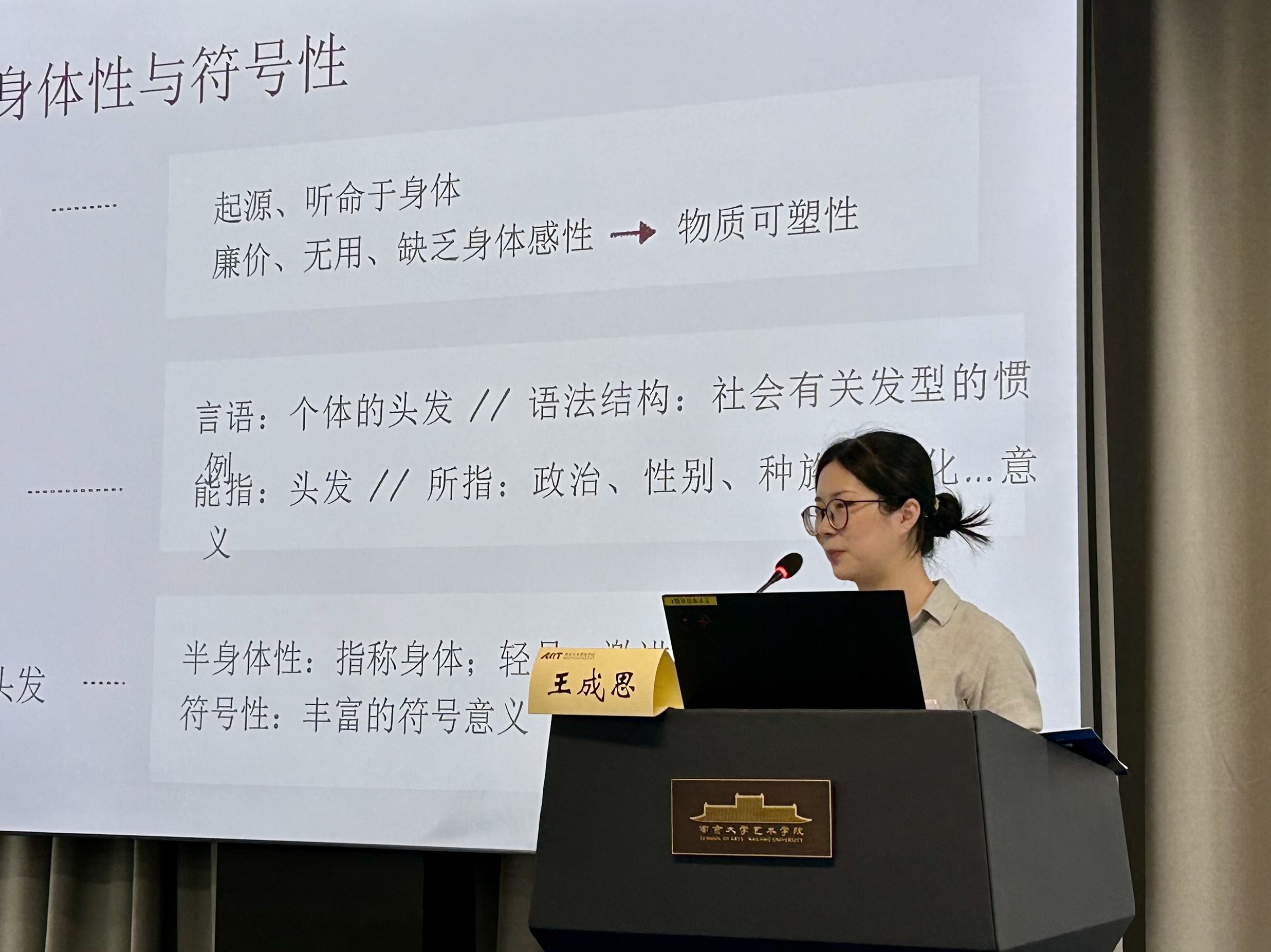 高薪副教授在评议中对四位博士生的报告给予了高度评价。针对王成思关于“头发”作为艺术媒材的研究,高薪副教授称赞其问题意识源于对当代艺术特定范式的关注,并精准地选取了头发这一极具代表性的媒材。她建议,为加固、深化论文根基,可进一步结合当代艺术的核心理念进行探讨,从而更清晰地阐释“当代”作为一种艺术理念的内涵。