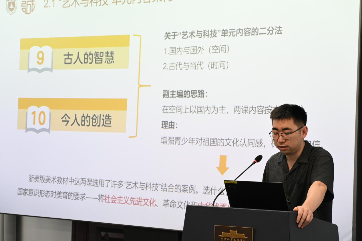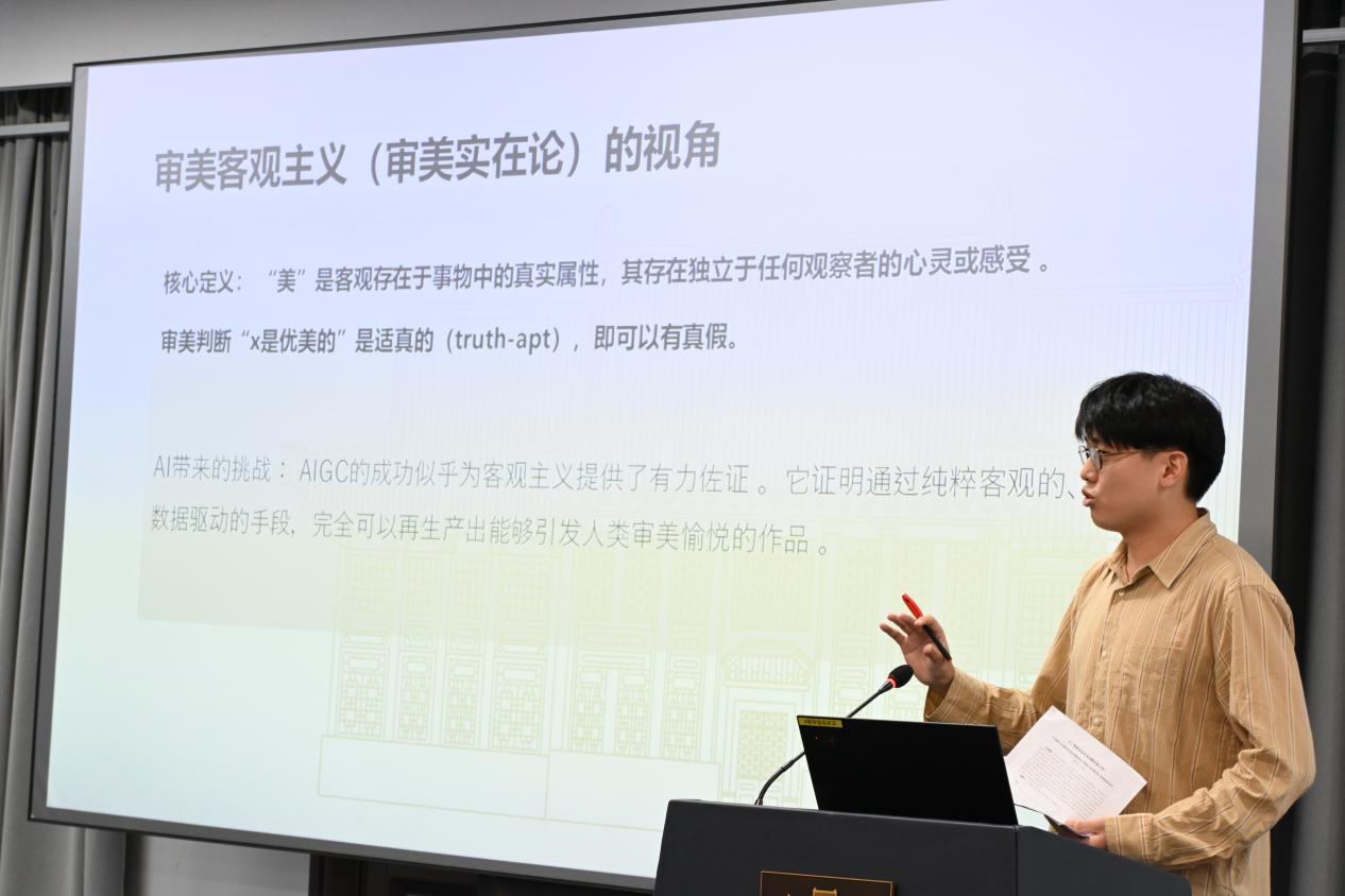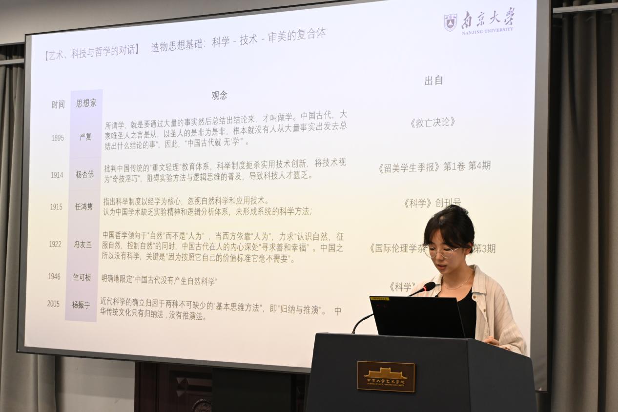 第六场论坛为其他相关主题的汇报,由丝瓜视频 的傅王雪萌主持,东南大学陈少鹏副教授评议。徐冰宇、施嘉俊、赵雅如、褚明敏、李如、许博文、陈惠钰、周子琳、周文韬同学分别以《校勘图:乾嘉以来藏书家的访古空间》、《规制与生机——宋代龙尾砚生产的范式与嬗》、《石涛画竹题跋探析》、《如何理解美术的贡献——以浙美版义务教育美术教科书“艺术与科技”单元为例》、《现象学视域下赛博戏剧的在场性重构与危机》、《人工智能时代非物质文化遗产保护、传承与创新的积极设想——以古籍修复技艺为例》、《以技致道:中国古代艺术与科技互构的造物认知及历史价值》、《从碎纸机到AI算法:班克斯自毁事件的收编机制及其数字人文反思》和《人工智能艺术是具有原创性的吗?》为题进行汇报。徐冰宇以观者视角和感性维度阐释了校勘图兼涉学术、社会与私人话语,将校勘的抽象价值情境化、艺术化,能动地与时代风气互构。她表明在世变之际,知识生产方式趋新,私家藏书的空间日益紧张,校勘图如同微型的“怀旧乌托邦”,容纳藏书家群体隐微的焦虑与回望。施嘉俊以宋代龙尾砚为研究对象,聚焦其兴盛动因、生产范式及后世演变。赵雅如从石涛的画作题跋中对他的创作情感和绘画理论做出总结。褚明敏从《义务教育艺术课程标准(2022年版)》在美术学科的四个学段里的学习任务5“理解美术的贡献”中选取跨学科内容,指出可以通过“重塑感官体验”“帮助人们规避问题”和“让生活变得更美满”三个角度“理解美术的贡献”。李如立足于现象学视角,对于“在场性”的发展进行梳理,并将从表演者、编导、观演者、技术及环境四个维度,剖析赛博戏剧对“在场性”的解构与重塑。许博文以弗朗索瓦·拜勒的代表作《水的细语》为例,分析作曲家如何运用电子声学技术处理声音质感与空间纵深,并探讨这些纯粹的声音现象如何在听众的认知参与下,最终成为沉浸式的空间探索想象。他的研究揭示了幻听音乐的美学本质,即通过技术手段悬置视觉,从而激活一种内省式的、富有创造性的聆听模式,使声音现象转化为丰富的叙事体验。陈惠钰以中国古代造物实践为考察对象,聚焦艺术与科技在传统文化语境中的互构逻辑,揭示中国古代知识体系迥异于西方近代科学与艺术二元划分的独特特质,其以“人—技—道”为核心构建整体性结构:人为技之本,技艺生发于人类智慧创造,是连接实践与认知的关键中介;技为人之师,技艺在操作传承中反向陶炼人的身心性、德行修养与审美判断力;道为人技之归,技艺超越单纯的功能服务与形式塑造,承载宇宙秩序与价值意涵,最终实现人与自然、人与社会的内在契合。周子琳以班克斯《女孩与气球》的自毁事件为案例,探讨其艺术批判在人工智能时代所面临的困境与转型可能。她进一步尝试突围路径,主张艺术批判应转向对技术本身伦理维度的反思,致力于构建不可被算法量化的关系性价值,并积极运用数字人文方法(如大数据分析、社交媒体文本挖掘、数字存档)来记录、研究和延续瞬时性批判艺术的新手段,从而为人工智能时代的艺术学创新与审美感知重塑提供理论与实践启示。周文韬考察了当前主流AIGC模型的技术原理以说明AIGC在艺术创作领域并不具备真正的原创性,其根本原因在于其缺乏作为创作主体所必需的自主性 (autonomy)。陈少鹏副教授进行了细致评议,表示九位同学的研究具有非常强烈的多样性,从古到今,从东到西。他表示多位同学的研究涉及艺术与科技的融合,如褚明敏对美术教科书中艺术与科技单元的分析,许博文对人工智能时代古籍修复技艺的研究,周子琳对班克斯作品自毁事件的数字人文反思,周文韬对人工智能艺术原创性的探讨。这些研究展示了科技在艺术创作、保护和传播中的重要作用,也反映了科技对艺术观念和实践的深刻影响。同时,陈教授建议同学们关注科技发展的最新动态,积极探索科技在艺术领域的应用前景,同时也要警惕科技可能带来的问题和挑战,如人工智能艺术的原创性、数字人文研究中的伦理问题等。