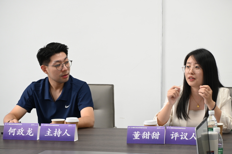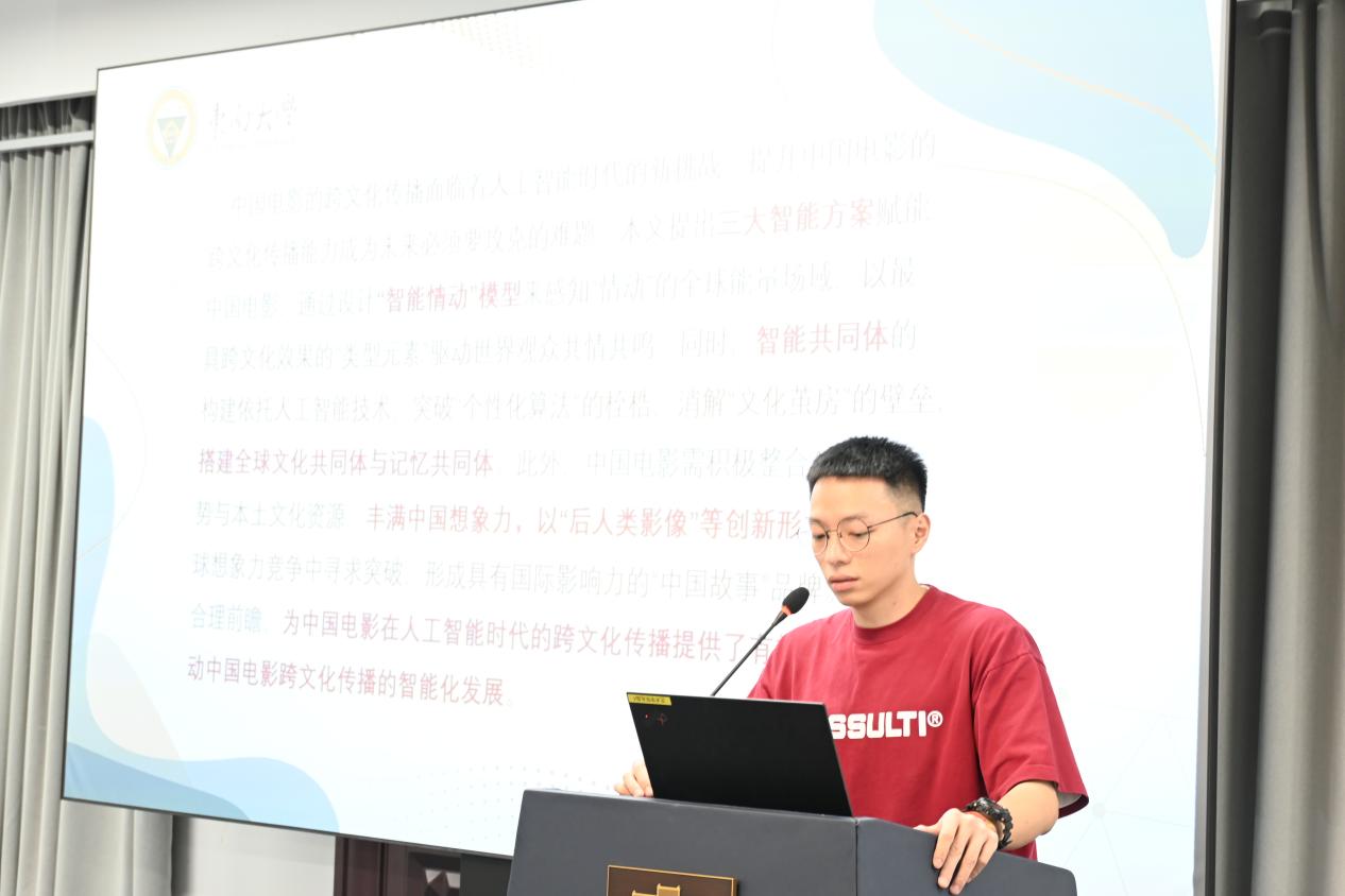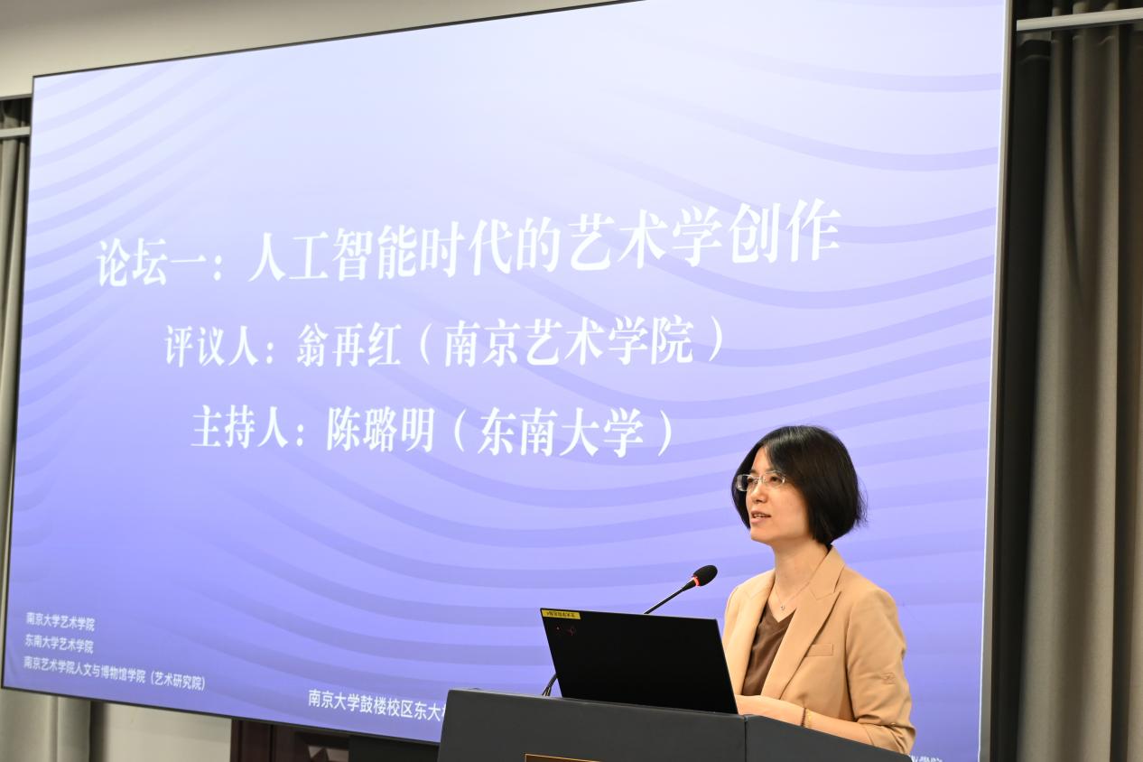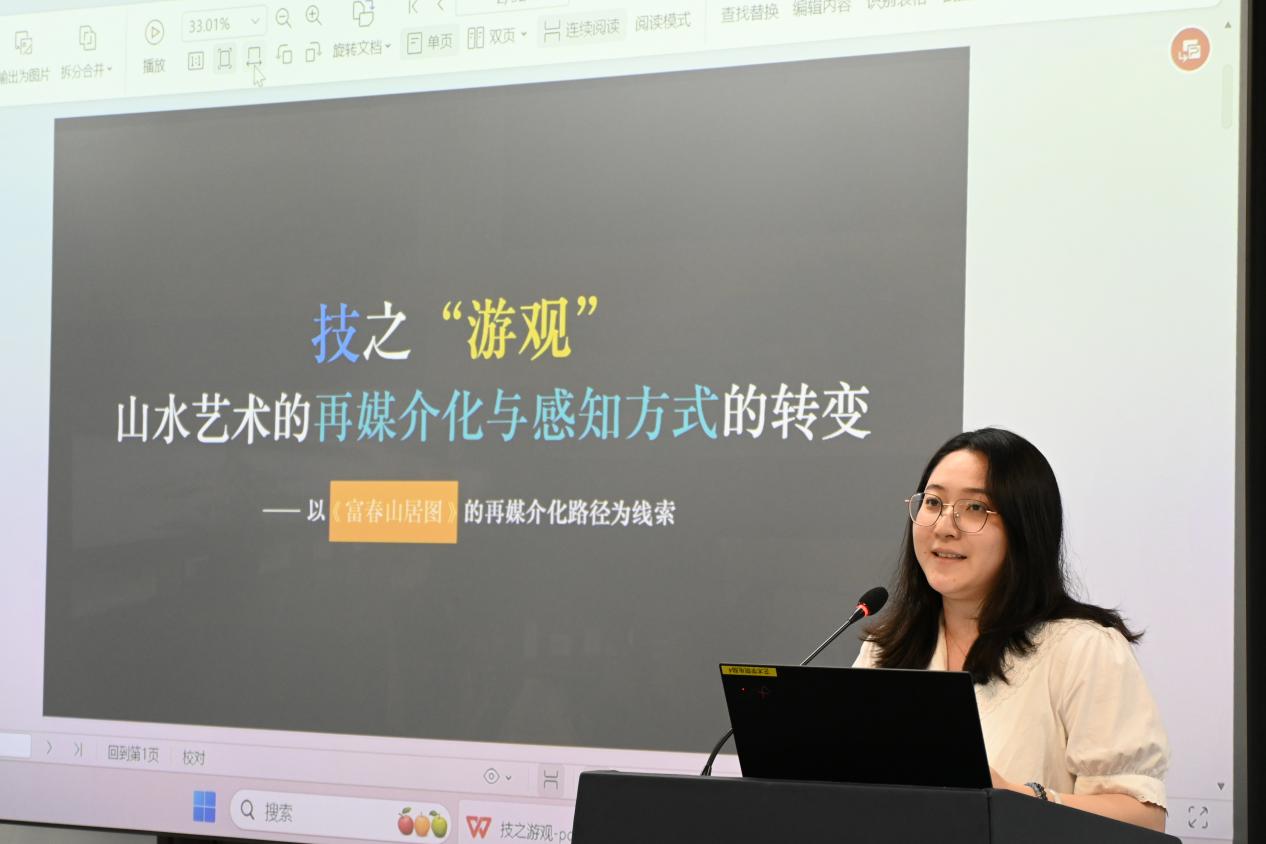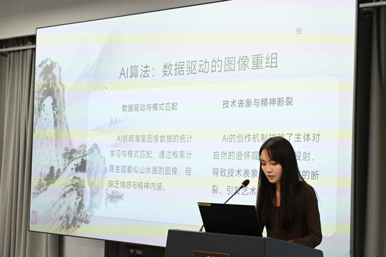 第一场关于“人工智能时代的艺术学创作 ”的讨论于310报告厅进行,主持人为东南大学博士生陈璐明,南京丝瓜视频 人文与博物馆学院(艺术研究院)副院长翁再红教授担任评议人。陈璐明、赵玉琪、吴行健、姜丞怡、王静、邹青宸分别以《情动、共同体与想象力:中国电影跨文化传播的智能方案》、《从田野到云端:数字化时代背景下浒浦花鼓的传承与创新》、《编剧还是工具?——人机协同背景下剧本创作主体的边界争议》、《当代接受美学中文征明对沈周绘画的学习》、《走近、走远:夏尔丹的<肥皂泡>及沙龙展陈》和《从“笔墨为心迹”到“算法为媒介”:人工智能介入下中国山水画创作困境与伦理重构》为题,都关注数字技术或人工智能在艺术创作、文化传播和审美接受中的应用,探讨如何在利用新技术的同时,保持和传承传统艺术和文化的价值。南京丝瓜视频 的翁再红教授为每位同学的论文都进行了细致的评审,表示虽然他们的研究领域和具体问题各有侧重,但都关注了在技术介入的背景下,创作主体的角色变化及其带来的伦理挑战,并试图寻找在技术与传统之间平衡的方法和路径。翁再红教授依据自己在学术研究领域的专长以及治学经验,给他们具体的改进建议。