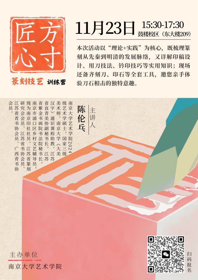 篆刻作为中国非物质文化遗产,文化积淀深厚,与书法、绘画与雕刻共融共生。本次活动以“理论+实践”为核心,既梳理篆刻从先秦到明清的发展脉络,又详解印稿设计、用刀技法、钤印技巧等实用知识;现场还备齐刻刀、印石等全套工具,邀您亲手体验刀石相击的独特意趣。无需基础即可轻松上手,在沉浸式操作中感悟传统技艺的精妙,于方寸印面间与古为徒、与古为新,神会中国古典文人的修身之道与求道之心。