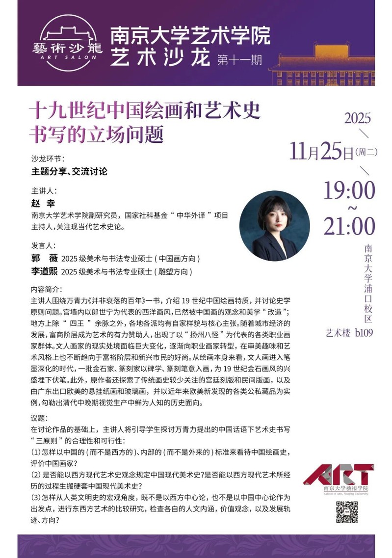 在讨论作品的基础上,主讲人将引导学生探讨万青力提出的中国话语下艺术史书写“三原则”的合理性和可行性: