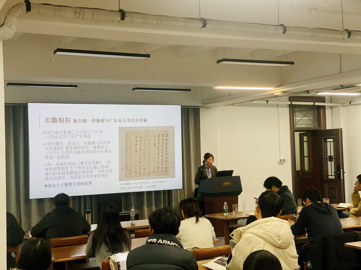 2025年12月12日,香港中文大学文物馆何碧琪研究员应邀来院作学术讲座,主题为“金石学兴起对清代书法史影响的思考”,讲座由黄厚明教授主持。讲座伊始,何老师指出,本次讲座延续了她自硕士至博士阶段持续关注的问题:金石学虽在宋代已蔚为大观,为何碑学书风的勃兴却独独发生于清代?清代金石学如何推动碑学兴起,并引发对书法传统的认知变革?这一问题意识贯穿讲座始终,亦体现出艺术史与社会史、思想史及政治文化史相结合的研究视野。