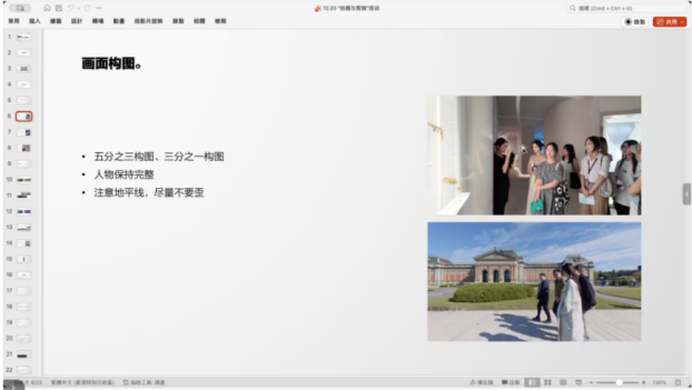 12月20日,收官之期“光影叙事,帧间生花”通过线上方式举行,聚焦视频内容创作全流程。主讲人新媒体中心主任雷馥键系统梳理拍摄与剪辑的核心规范,从构图技巧、画面控制到景别运用与机位移动,逐一讲解如何通过镜头语言增强叙事表现力。