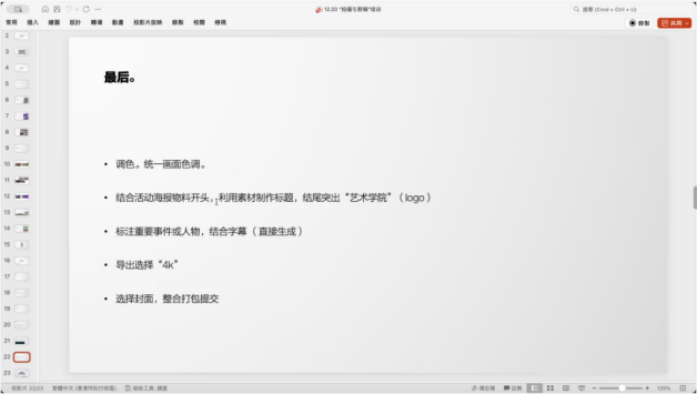 在后期制作环节,她分享了音频卡点、镜头时长控制、色彩统一等实用技巧,并强调成片输出以4K为佳,以保障影像质感与专业度。