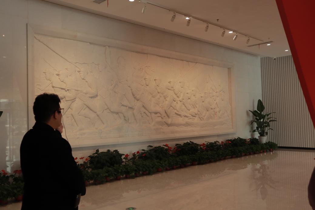 党员们随后来到渡江胜利纪念馆,讲解员系统回顾了渡江战役的历史背景、战略意义与人民群众的巨大贡献。展厅中的大型汉白玉浮雕《胜利渡长江》以磅礴的气势再现了战士们以木帆破浪、奋勇冲锋的壮烈场景。高、浅浮雕结合的艺术表达,让人物形象饱满鲜活,战斗氛围紧张激越,生动记录了1949年横渡长江、解放全中国的伟大历史瞬间,成为承载民族记忆的不朽丰碑。