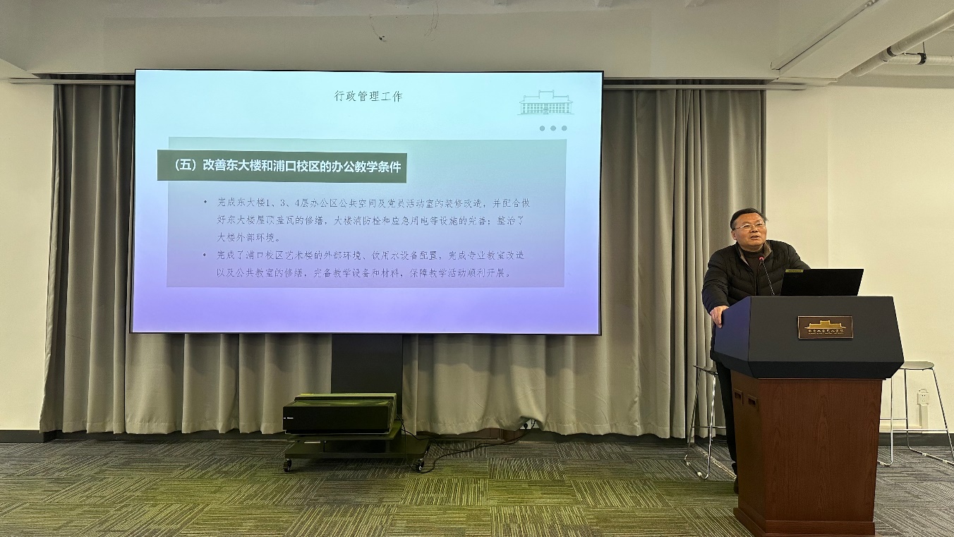 首先由何成洲院长向大会做2024年度行政工作报告。学院在学科建设上亮点纷呈、科研工作业绩突出、队伍建设成效显著、人才培养成绩斐然、本科教学圆满完成、国际交流日趋频繁、校园文化活动丰富精彩、社会服务长足进步、治理能力明显提升。学院在各项事业上获誉不断、喜事连连,得到了全体教职工的赞许。