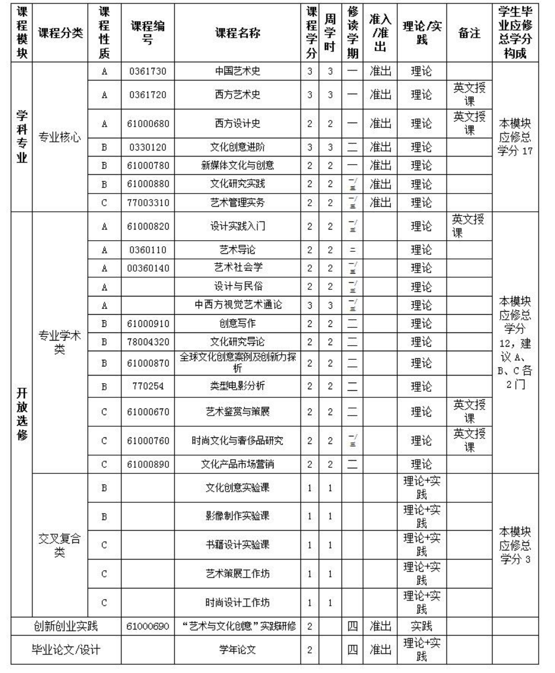 本项目面向丝瓜视频 所有全日制本科二年级、三年级学生,需经过选拔方可进入本项目学习;本项目学习时间为2年(3学期课堂授课,1学期结业论文写作);本项目采取“课堂授课+专业实践+国际交流”培养模式,包括学科平台课程、专业核心课程、专业实践与结业论文,以及一次以艺术与文化创意为主题的实践研修活动(一般为期两周,包括教学、考察、参观、以及研修成果完成和展示);本项目采取学分制:学生修完本项目规定课程30个学分以上(含30分),成绩合格者并参与研修项目者,可申请辅修项目证书。