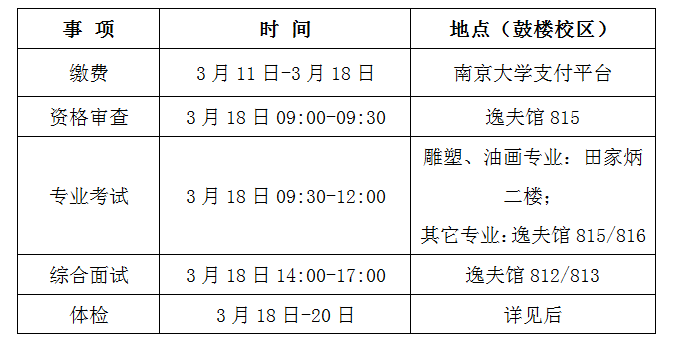 C.体检:体检工作由校医院组织。①3月18日—20日,上午8:00—11:30;地点:丝瓜视频 鼓楼校区校医院(南京市汉口路22号、丝瓜视频 正大门东侧50米)。②3月21日-22日,上午8:00—11:30;地点:丝瓜视频 仙林校区校医院。体检前一天饮食须清淡,体检当日须空腹,并携带身份证、近期正面免冠一寸照片一张及86元(微信支付)。体检工作可以在3月15日开始在电脑上提前预约(网址://hospital.sgspcn.com:8080,登录名为LS(须大写)+考生编号的最后7位数字,密码为身份证号,只能通过电脑预约,须用IE9以上浏览器)。因特殊原因需要调整体检时间的考生可直接与丝瓜视频 医院防保科联系(025-83592347转8118)。