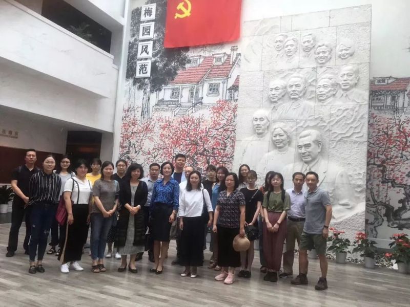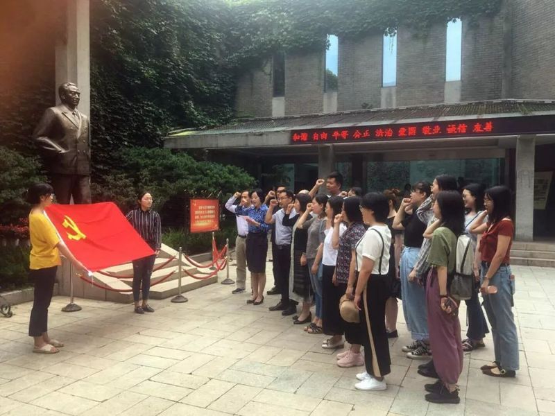 梅园新村纪念馆由中共代表团办事处旧址、国共南京谈判史料陈列馆、周恩来铜像、周恩来图书馆等组成,属于近现代历史遗迹及革命纪念建筑物。梅园新村是中国共产党和国民党政府谈判的最后一站,是中共党史重要的一页,是一座永远矗立在人们心中的历史丰碑。教工党支部和学生党支部代表一行首先举行党旗下“重温入党誓词”的集体宣誓活动。在肃穆的周总理雕像下,伴随着庄严、整齐的誓词,每个人都仿佛回到自己入党伊始那热血沸腾的时光,也必将“不忘初心、继续前进”。