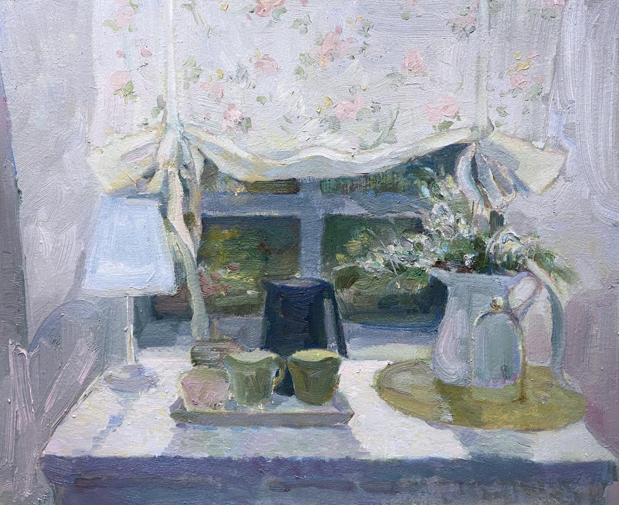 这幅作品静物以侧面呈现出来,以扁平的方式描绘,削弱了物体的立体感,增强画面的构成感,背景用色块进行分割,用简洁的形达到画面的装饰感。整幅画面用色较少,以白色、蓝绿色、墨绿为主,力求画面的简洁性,静物都统一在蓝白色调中,背景的风景明度居中,而深色的背景则起到稳定画面的作用,使这幅画在黑白灰关系上富有节奏感。