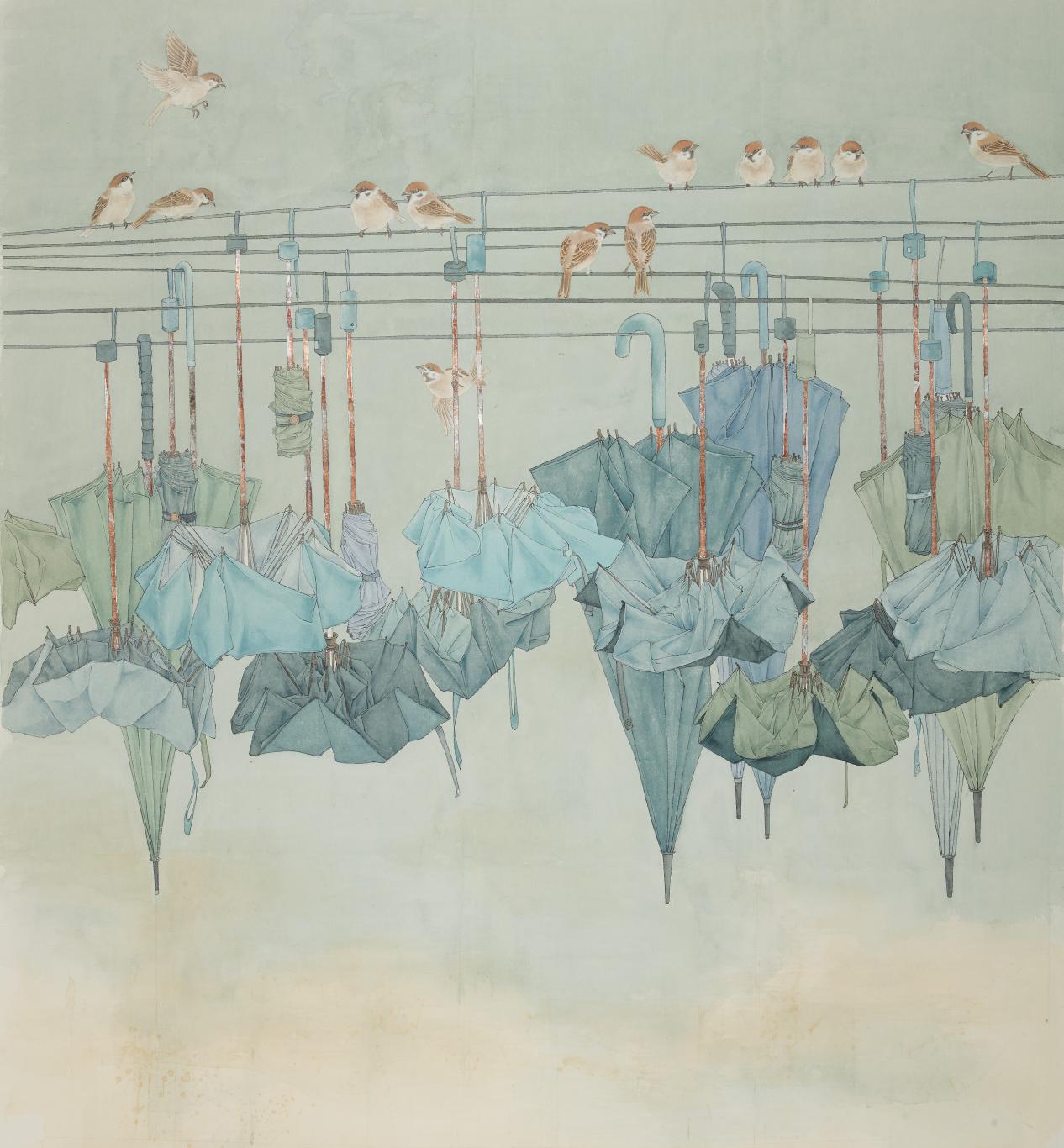 《放晴》这幅作品缘起于一个阴雨天,画者偶然间发现一群麻雀躲在廊下避雨,廊下同时摆放着一组晾晒的雨伞,正是这样偶然的场景激发了笔者的创作欲,并且以此主体创作了系列作品。《放晴》就是雨季三部曲中的一幅作品,除此之外还有《传统》《等待》等作品。将麻雀与雨伞相结合,以禽鸟的动态反衬雨伞的静态,营造出雨后静谧的氛围。