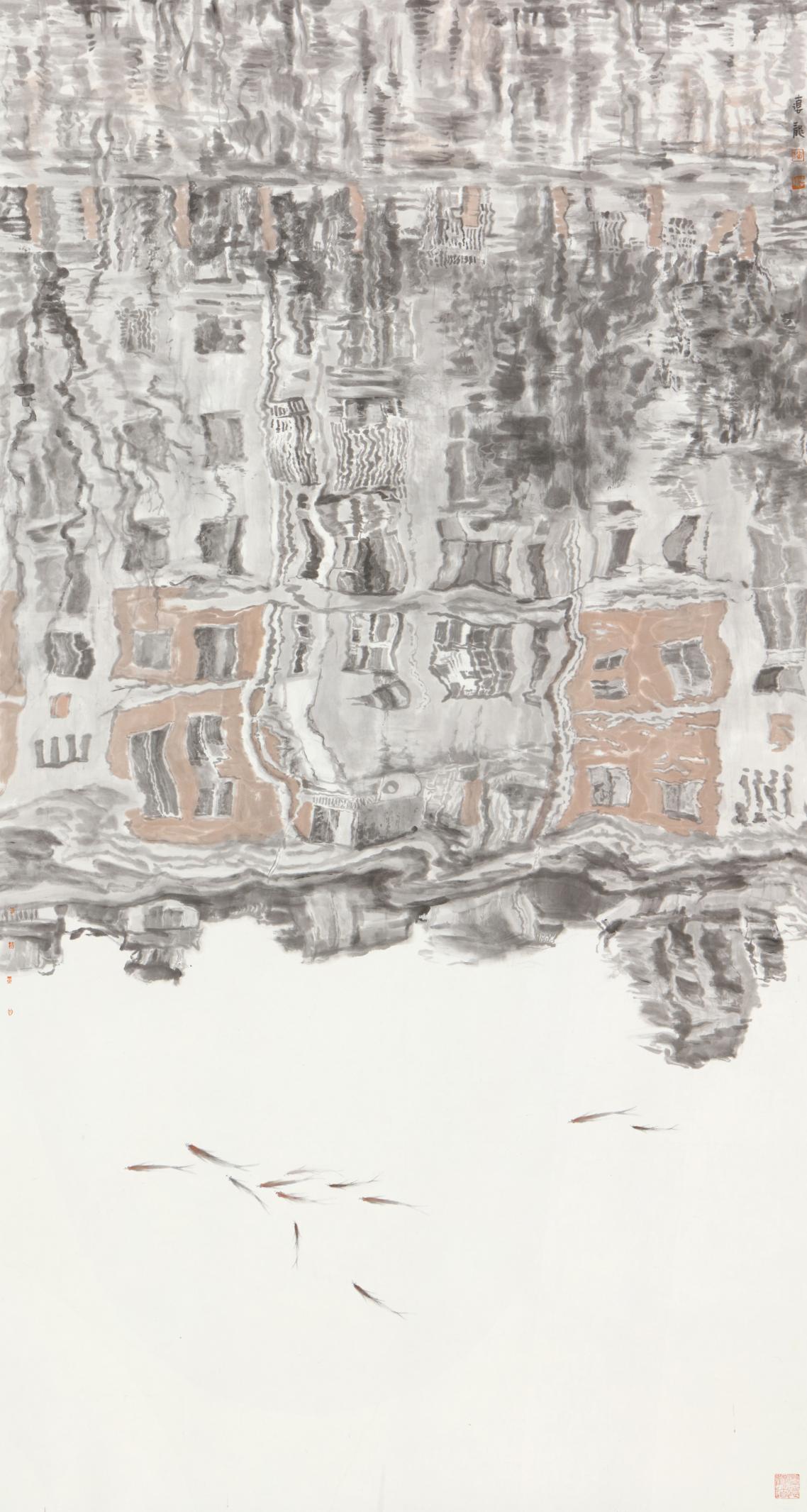 刘德龙《风推水舞魚逐浪》纸本水墨 180cm×97cm 2020年