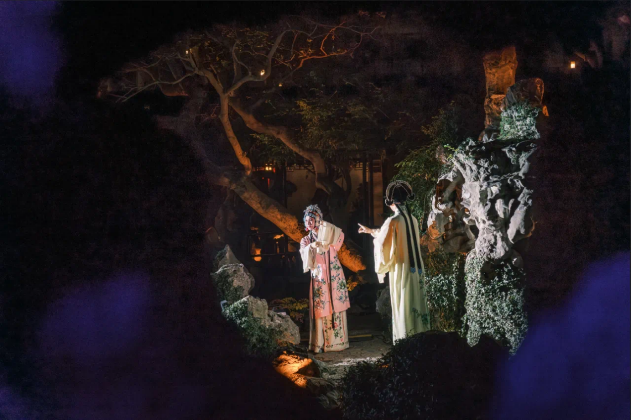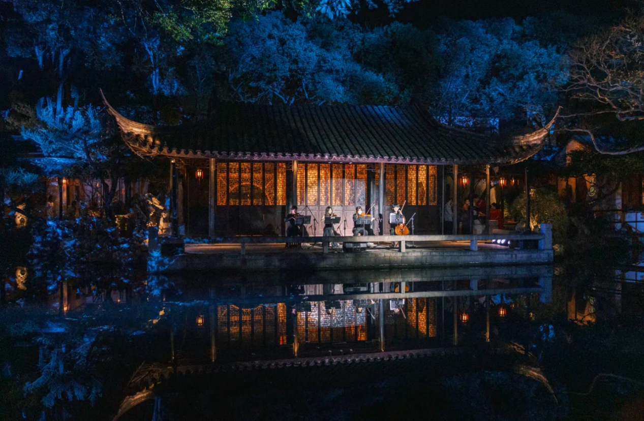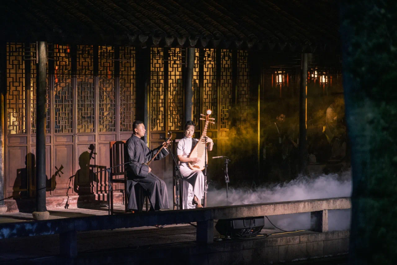当日晚19:30“青春时光”青年艺术家展演在同里退思园拉开帷幕。青年艺术家们于建筑、文学、戏剧、书画、哲学、山水自然间,共赴一场如梦如幻的视听盛宴。精妙的舞美让观众沉浸式地感受江南文化的魅力,传统与现代、戏曲与建筑的融合,以青春为题,刻画江南园林新的“灯火阑珊”。青年艺术家作品展演以音乐、舞蹈、戏曲等形式给予了动态的沉浸式体验,呈现出江苏省青年艺术家们在新时代融合新创意的创造潜力。