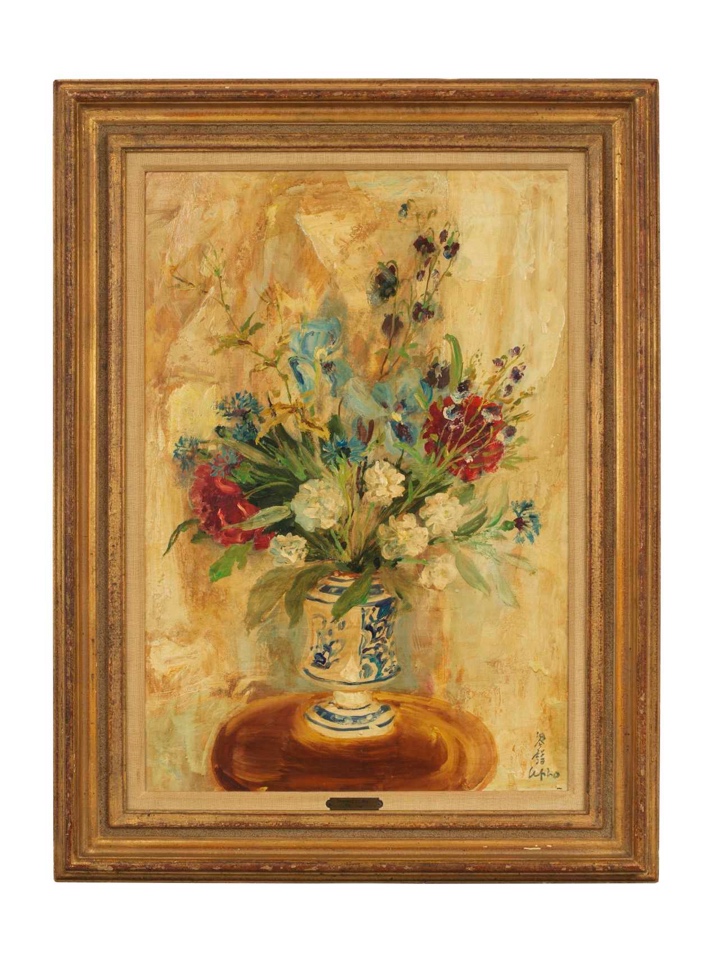 图2 黎谱《牡丹和鸢尾花》1958年,绢面油画,德基艺术博物馆藏