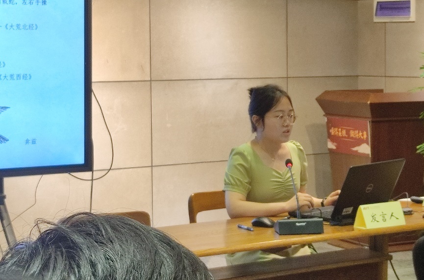 中国艺术研究院的武灵同学作了题为“汉代操蛇神人图像研究”为题的报告,她指出,操蛇神人图像在汉代已不多见,但在汉代的一些主流图像中仍能发现操蛇神人图像的遗留,并与先秦时期操蛇图像存在相似性,因此操蛇神人图像在汉代仍旧有着旺盛的生命力。