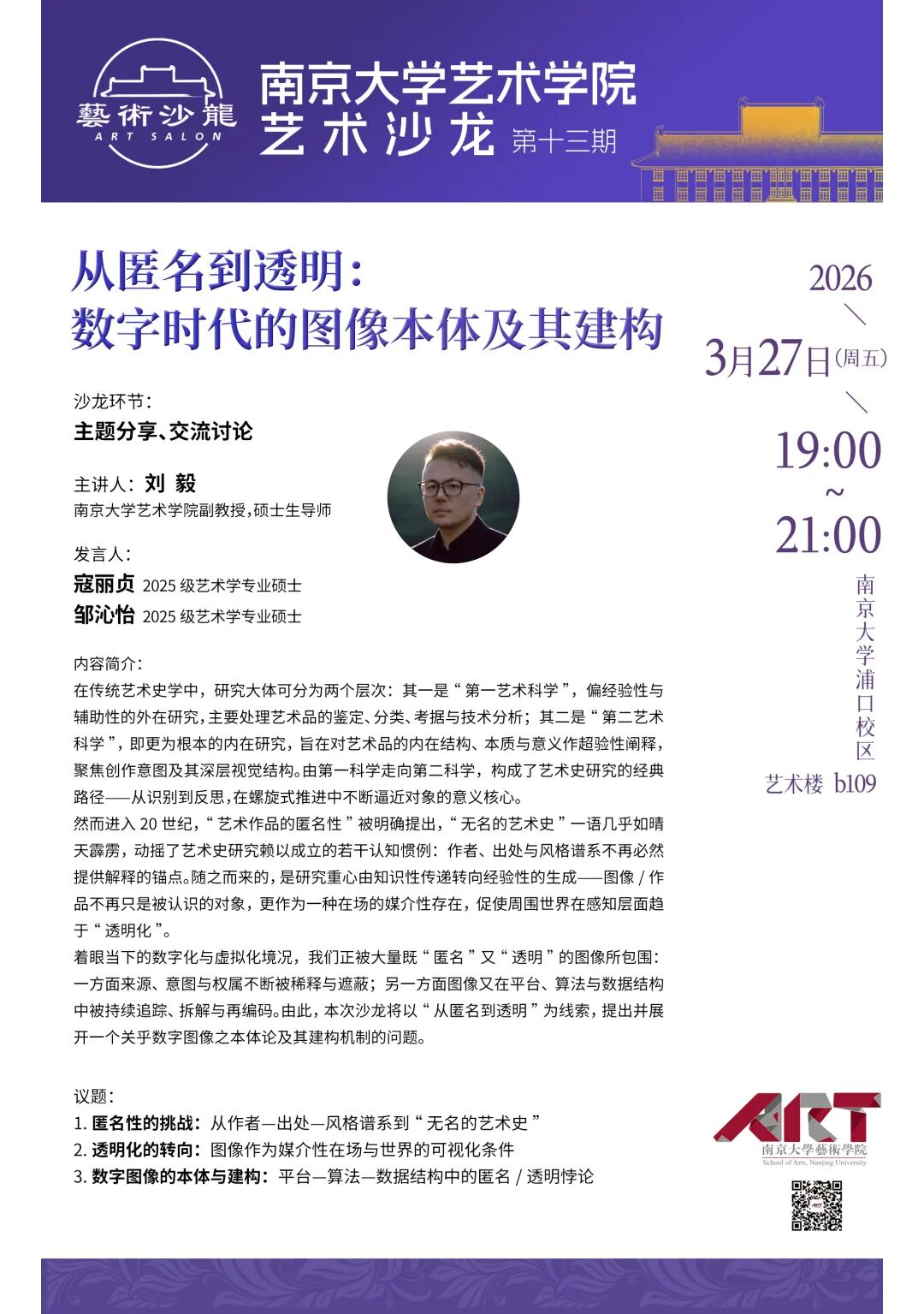 着眼当下的数字化与虚拟化境况,我们正被大量既“匿名”又“透明”的图像所包围:一方面来源、意图与权属不断被稀释与遮蔽;另一方面图像又在平台、算法与数据结构中被持续追踪、拆解与再编码。由此,本讲座将以“从匿名到透明”为线索,提出并展开一个关乎数字图像之本体论及其建构机制的问题。