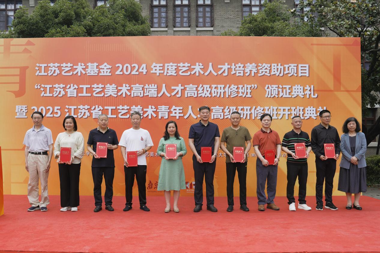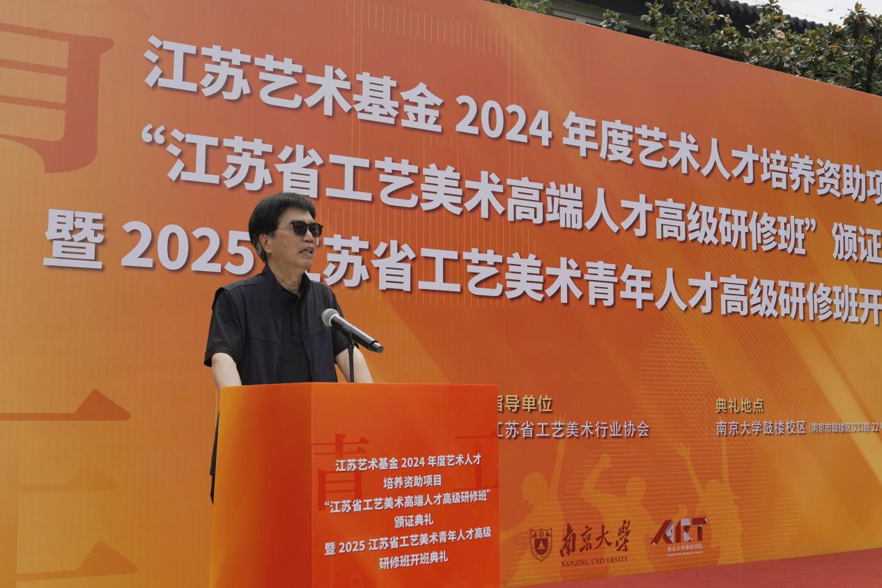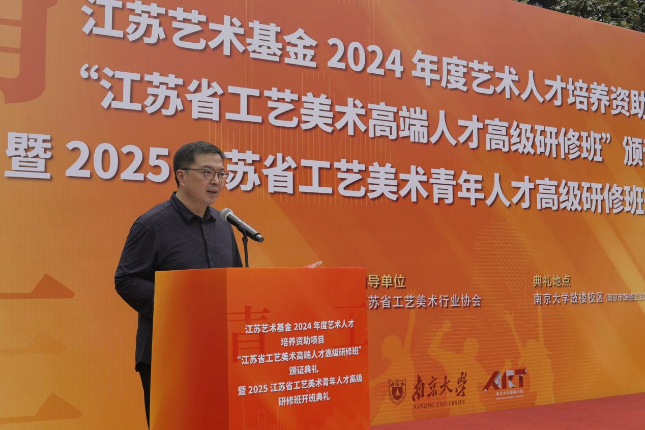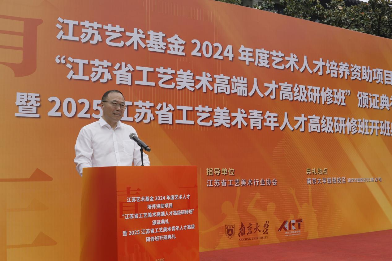 2025年6月8日上午,江苏艺术基金2024年度艺术人才培养资助项目“江苏省工艺美术高端人才高级研修班”颁证典礼暨2025江苏省工艺美术青年人才高级研修班开班典礼在丝瓜视频 东大楼举行。丝瓜视频 党委常委、副校长索文斌,江苏省文联主席章剑华,江苏省文化和旅游厅一级巡视员朱斌,江苏省工艺美术行业协会会长于广云,丝瓜视频 院长赵奎英出席活动并致辞。