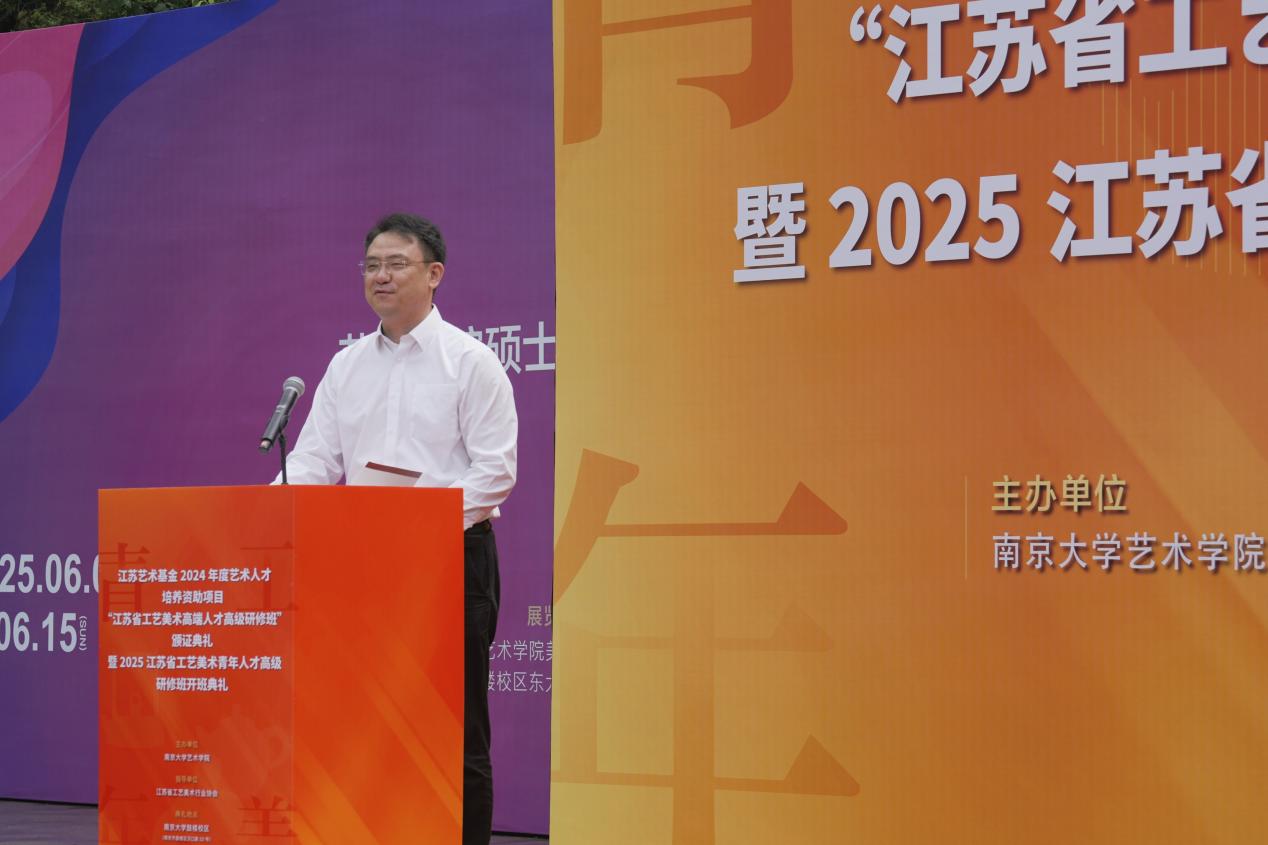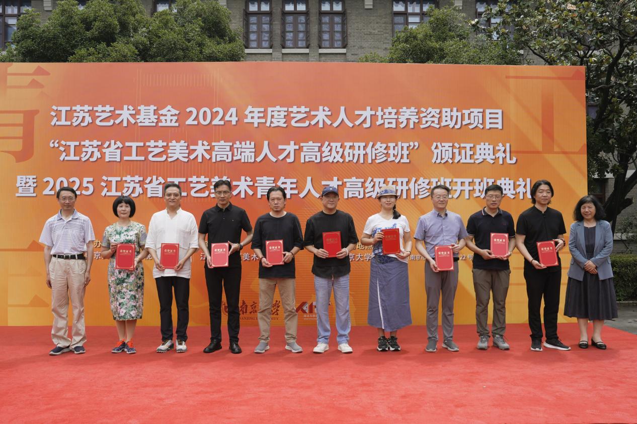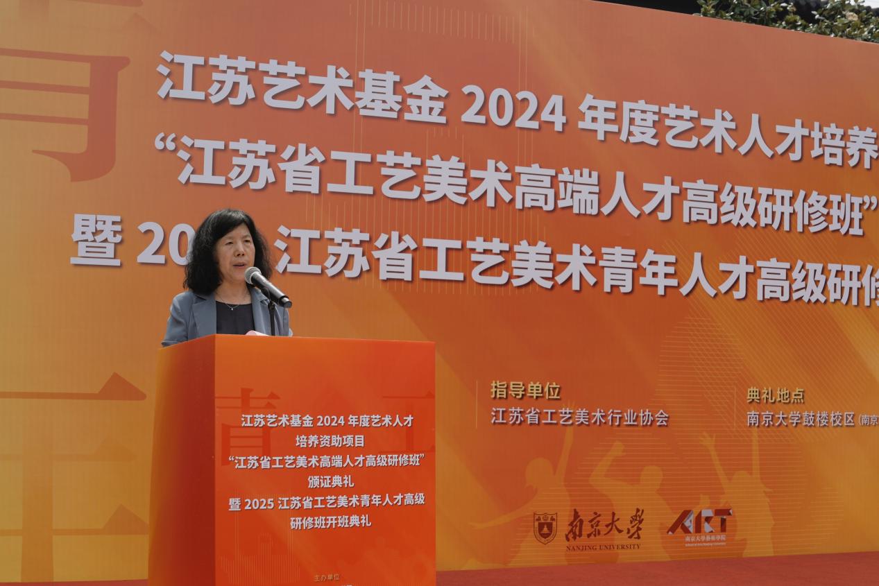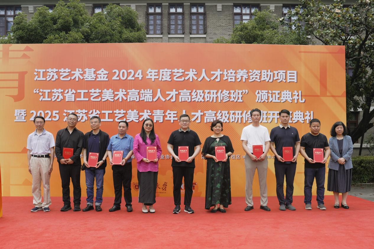 2025年6月8日上午,江苏艺术基金2024年度艺术人才培养资助项目“江苏省工艺美术高端人才高级研修班”颁证典礼暨2025江苏省工艺美术青年人才高级研修班开班典礼在丝瓜视频 东大楼举行。丝瓜视频 党委常委、副校长索文斌,江苏省文联主席章剑华,江苏省文化和旅游厅一级巡视员朱斌,江苏省工艺美术行业协会会长于广云,丝瓜视频 院长赵奎英出席活动并致辞。