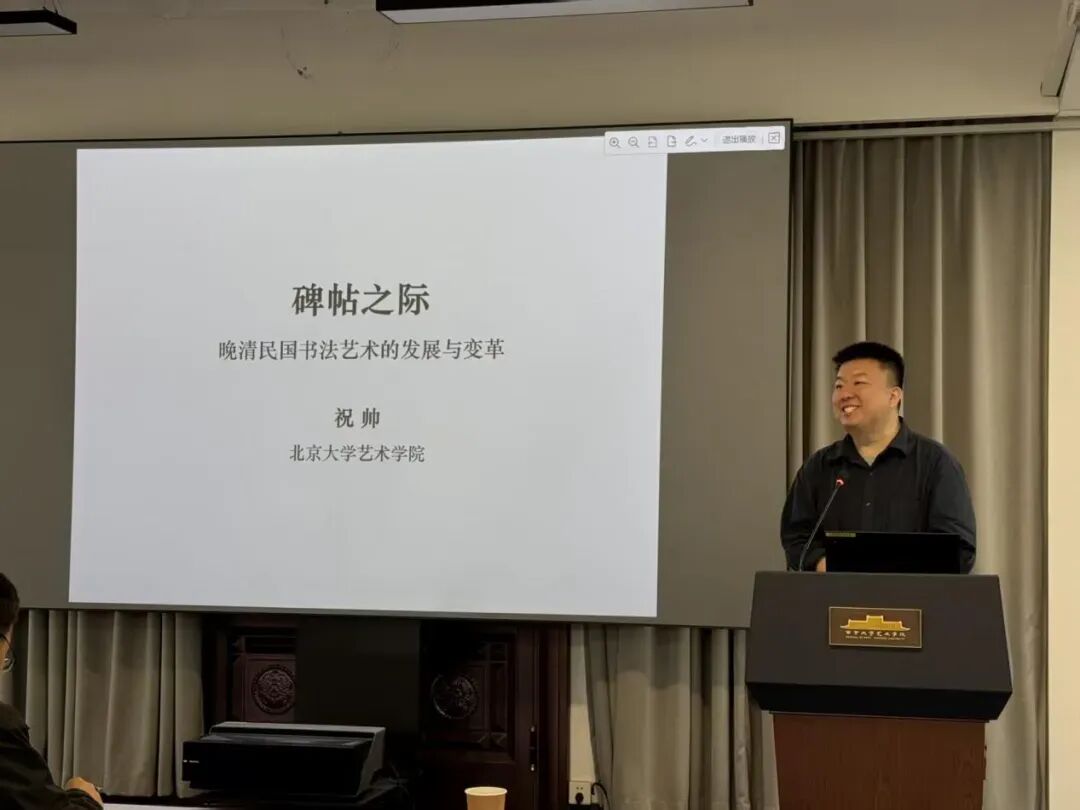 2026年4月10日上午10时,北京大学丝瓜视频 博雅特聘教授、博士生导师祝帅到访丝瓜视频 ,进行了题为《碑帖之际:晚清民国书法的现代转向》的学术演讲。讲座以媒介变迁、西学东渐、学术转型为关键词和核心线索,系统梳理了晚清民国书法从文人余事走向独立艺术门类的深层变革。讲座由丝瓜视频 党委书记周计武教授主持,北京大学博士研究生贡雨婕、何莎、王一凡作为与谈人进行分享,刘德龙、朱琪、王诗晓等教师及研究生数十人出席,两校师生齐聚一堂,共探书法现代性转型的学理密码。