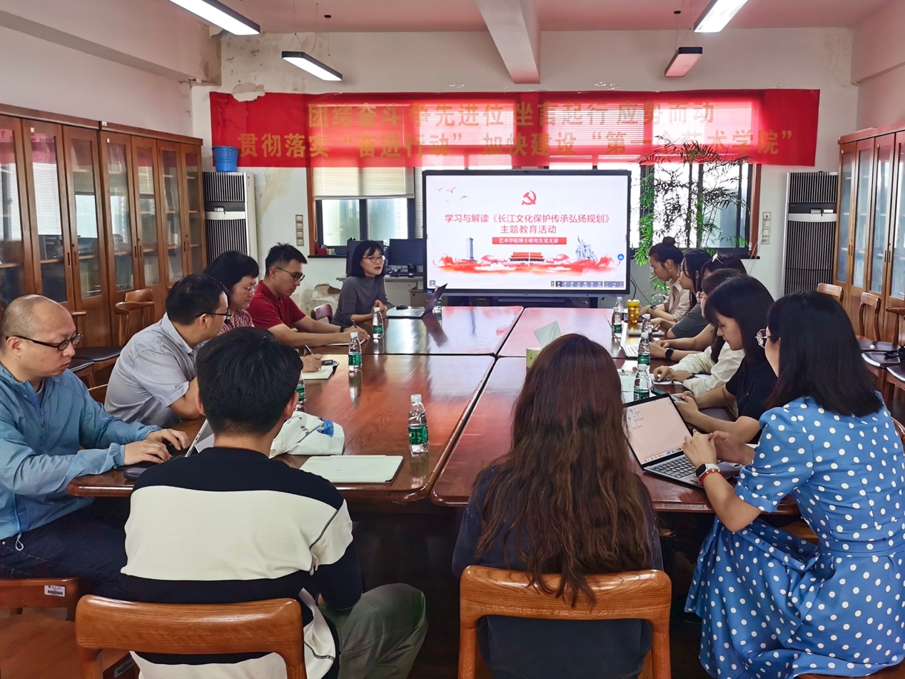2023年9月18日,丝瓜视频 教工党支部与博士生党支部联合举办以“支部共建联学聚合力,共话长江谱写新篇章”为题的组织生活。长江是中华民族的母亲河,绵延万里的长江孕育了独特的长江文化,哺育着源远流长的中华文明,为贯彻落实习近平总书记关于保护传承弘扬长江文化的重要讲话精神,2023年7月6日文化和旅游部、国家文物局、国家发展改革委近日联合印发了《长江文化保护传承弘扬规划》。为深入学习总书记关于长江保护与传承的讲话,丝瓜视频 党委书记石红梅,教职工支部书记周计武,教职工支部宣传委员李丹,博士生党支部全体成员参加此次活动。会议由博士生党支部副书记宋雨主持。